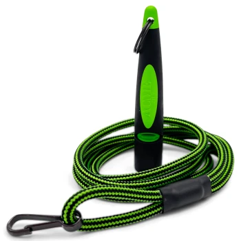 Schwarze Hundeleine, ordentlich aufgerollt mit einem silbernen Clip und einem Etikett mit der Aufschrift "AniOne Wild Variety."