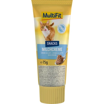 Flasche MultiFit Katzenmilch mit einer verspielten orangefarbenen Katze, die sich die Lippen leckt, beschriftet "Katzenmilch" und "Snacks" in mehreren Sprachen.
