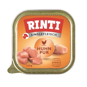 Hundefutterverpackung mit dem Gesicht eines Hundes, Hühnerstücken und dem Text: "Rinti Leichte Beute Huhn Pur - Pure Chicken, 300g, Low fat."