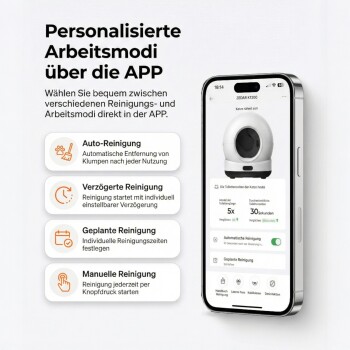 Neben der Bedienung über das Bedienfeld kannst du die Katzentoilette mit der kostenlosen App verbinden. Passe Einstellungen an, personalisiere den Reinigungsplan und erhalte Benachrichtigungen, wenn die Toilette gereinigt wurde oder Katzenstreu nachgefüllt werden muss.
