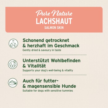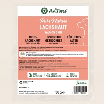 Die AniForte Lachshaut ist ein ganz besonderes Geschmackserlebnis - nicht nur für Fischliebhaberinnen und -liebhaber. Dabei kann der Vierbeiner sein angeborenes Kaubedürfnis auf ganz natürliche Weise ausleben und kann ihn sogar noch glücklich machen - egal in welchem Alter!