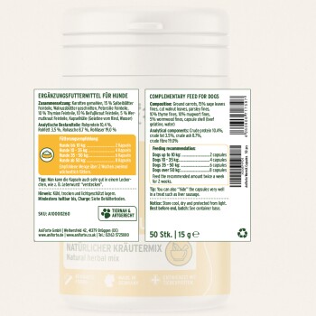 AniForte WermiX enthält ausschließlich pflanzliche Bestandteile wie Thymian, Beifuß, Wermut und Salbei und unterstützt besonders nach einem kurierten Wurmbefall.
