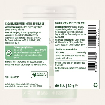 Unsere spezielle Kombination aus Bierhefe und Thiamin – auch als Vitamin B1 bekannt – stellt eine vitalfreundliche und geruchsneutrale Rezeptur dar, die durch Misch- und Mahlverfahren auf die notwendigen Bedürfnisse Deines Tieres angepasst wird. Unsere bewährte Mischung trägt zur Aufrechterhaltung der natürlichen Hautbarriere Deines Vierbeiners bei.
