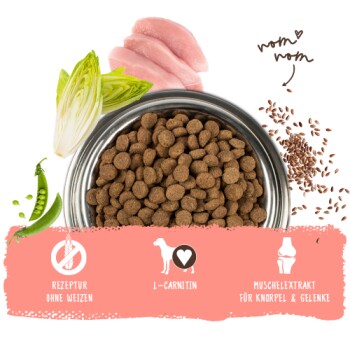 Bosch ACTIVE hat einen hohen Anteil an frischem Geflügel (min. 25 %) als hochwertige tierische Eiweißquelle und wird ohne Weizen hergestellt.