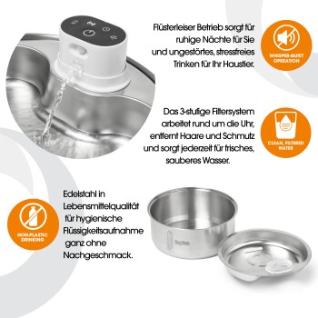 Das integrierte Filtersystem entfernt kontinuierlich Haare, Fusseln und Schmutzpartikel und sorgt dafür, dass jeder Schluck sauber und erfrischend bleibt. Der Brunnen ist einfach aufzubauen und leicht zu pflegen – wechseln Sie den Filter monatlich, um eine optimale Leistung zu gewährleisten.