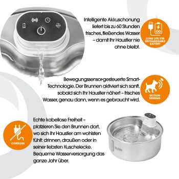 Dank echter kabelloser Freiheit können Sie den Brunnen flexibel dort platzieren, wo sich Ihr Haustier am wohlsten fühlt – im Haus, auf der Terrasse oder an seinem Lieblingsplatz. Ganz ohne störende Kabel oder Steckdosen in unmittelbarer Nähe.