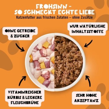 Unser Nassfutter „Frohsinn“ liefert Deiner Katze eine proteinreiche, ausgewogene Mahlzeit, die sie mit Feuchtigkeit versorgt und ihren natürlichen Bedürfnissen entspricht. Dank des hohen Feuchtigkeitsgehalts unterstützt „Frohsinn“ nicht nur die Ernährung, sondern auch die tägliche Flüssigkeitsaufnahme. Beobachte das Gewicht Deiner Katze regelmäßig: Eine gesunde Katze hat eine definierte Taille und fühlt sich muskulös an, ohne dass die Rippen zu stark hervorstehen. Sollte sich das Gewicht verändern, passe die Futtermenge entsprechend an. Mit einer individuell abgestimmten Fütterung bleibt Deine Katze gesund & glücklich