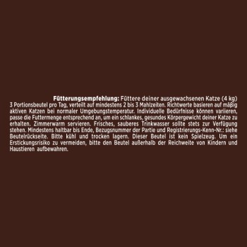 Füttern Sie Ihrer ausgewachsenen Katze (4kg) 3 bis 4 Portionsbeutel pro Tag, die auf mindestens 2 Mahlzeiten verteilt werden sollten. Diese Richtwerte basieren auf mäβig aktiven Katzen bei normaler Umgebungstemperatur. Individuelle Bedürfnisse können variieren, so dass die Futtermenge entsprechend angepasst werden sollte, um ein schlankes, gesundes Körpergewicht Ihrer Katze zu erhalten.