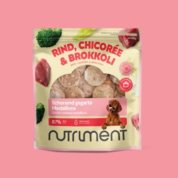 Medaillons Rind: 87 % Rind (17 % Muskelfleisch, Pansen, Niere, Lunge, Leber, Herz, Fett), 3,4 % Chicorée, 3,0 % Brokkoli, Karotte, Apfel, Lachsöl, Hanföl