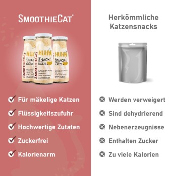 SmoothieCat ist ein Ergänzungsfuttermittel für Katzen, das ideal als Teil einer abwechslungsreichen und ausgewogenen Ernährung gefüttert werden kann. Die wiederverschließbare Flasche ermöglicht eine einfache Portionierung. Nach dem Öffnen sollte der Katzensmoothie im Kühlschrank gelagert und innerhalb von 3 Tagen verfüttert werden.