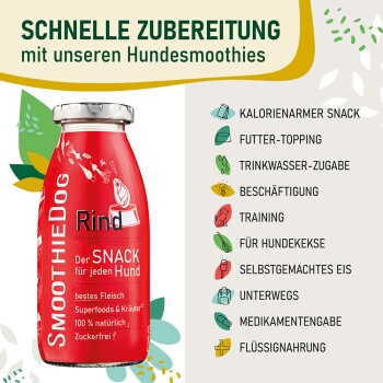 SmoothieDog ist ein Ergänzungsfuttermittel für Hunde und kann beliebig zwischendurch gefüttert werden.