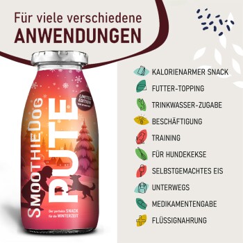 Limitierte Winteredition, getreidefrei und ohne künstliche Zusätze – der SmoothieDog Hundesmoothie „Pute“ ist ein milder, bekömmlicher Fleischsmoothie mit feinem Gemüse und fruchtiger Note. Perfekt für Hunde, die es leicht und ausgewogen mögen – im Winter und darüber hinaus.