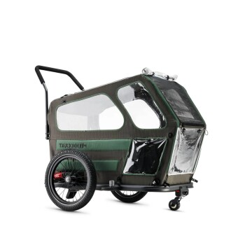 Der Anhänger ist mit wetterfester Abdeckung ausgestattet und kann dank des beiliegenden Bollerwagen-Sets auch als Handwagen genutzt werden. Die gepolsterte, abziehbare Bodenmatte sorgt für zusätzlichen Liegekomfort.