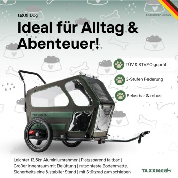 Der TAXXI DOG M ist die ideale Lösung für kleine bis mittelgroße Hunde, die dich auf Radtouren begleiten sollen. Dank integrierter Federung sorgt der Anhänger für eine besonders sanfte Fahrt und schont die Gelenke deines Vierbeiners – perfekt für längere Ausflüge, ältere Hunde oder Welpen.
