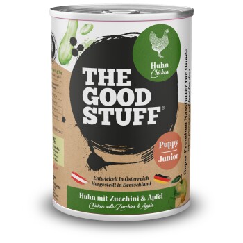 FEUCHTFUTTER HUHN & ZUCCHINI für Junghunde in bewährter THE GOODSTUFF Super Premium-Qualität. Unser Hunde-Nassfutter enthält 70% frisches Hühner-Muskelfleisch und hochwertige Innereien, wie Herz und Leber in Lebensmittelqualität. Schonend gegart und verfeinert mit regional verfügbarem Obst & Gemüse sowie ausgewählten Kräutern und Leinöl.