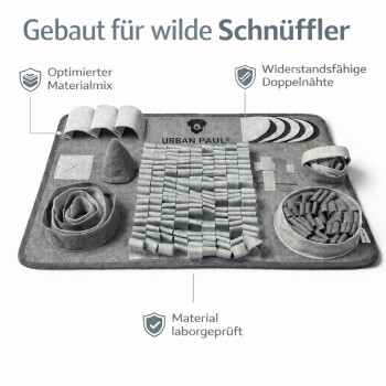 Unser Schnüffelteppich besteht aus Materialien, die weich genug für empfindliche Hundenasen und gleichzeitig robust im Alltag sind. Die eingesetzten Materialien in unseren Produkten werden zudem von unabhängigen Prüflaboren wie TÜV SÜD oder Intertek auf relevante Sicherheitsstandards (z. B. REACH) geprüft.