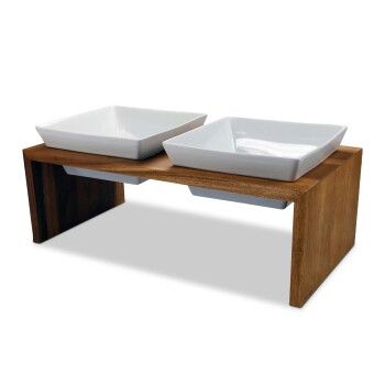 - ERGONOMISCHE FRESSPOSITION AUS NACHHALTIGEM HOLZ – Erhöhter Napf für eine komfortable, gelenkschonende Haltung beim Fressen.