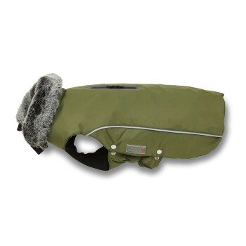 Die Winterjacke Amundsen ist eine warme und zugleich schicke Hundejacke für kalte Wintertage. Weiches Fleece-Innenfutter und ein flauschiger Kunstpelzkragen sorgen für wohlige Wärme, während das wetterfeste Außenmaterial zuverlässig vor Nässe und Wind schützt. Dank durchdachter Details wie Stretchgummi am Bauch, Reißverschluss am Hals und Geschirröffnung bietet die Jacke hohen Tragekomfort und ist ideal für Alltag und Winterspaziergänge.
